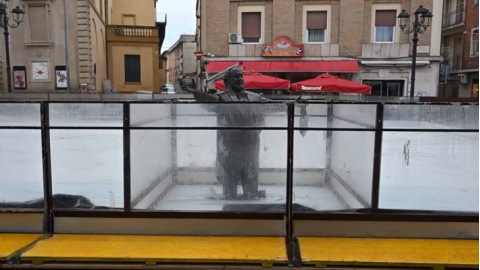 Sta facendo molto discutere – e anche ridere, a tratti amaramente – l’immagine della statua di Luciano Pavarotti in piazzale Lazzarini, completamente inglobata nel basamento della nuova pista di pattinaggio sul ghiaccio.